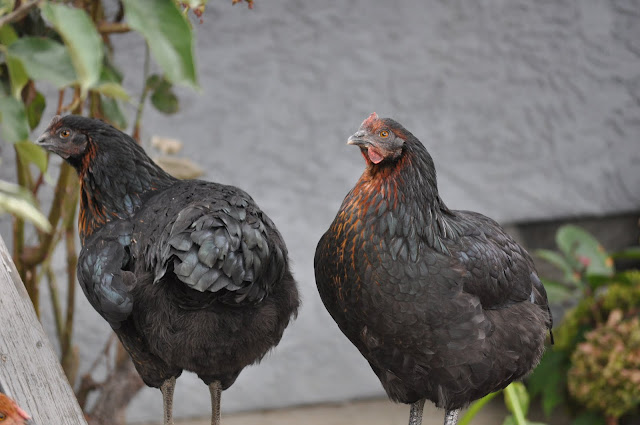 Miss Crump again (on right) and her sister, Thelma Lou, are both Black Sexlinks. All the chickens we have are brown egg layers. I didn't plan it that way, however. And though they will all lay brown eggs, they will not be alike. Some are much darker than others and one of the breeds tends to lay an egg that is pinkish brown.
